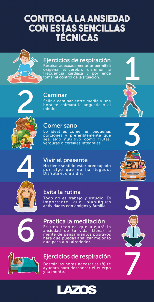 - Limite las conductas de evitación : si bien evitar las cosas que le provocan ansiedad puede proporcionar un alivio a corto plazo, esta estrategia tiende a empeorar la ansiedad a largo plazo. 9 En lugar de evitar los factores desencadenantes, concéntrese en afrontarlos gradualmente. Empiece poco a poco y utilice estrategias de afrontamiento para reducir sus sentimientos de ansiedad . Utilice técnicas de relajación como la respiración profunda y recuerde que los pensamientos ansiosos son sólo pensamientos.