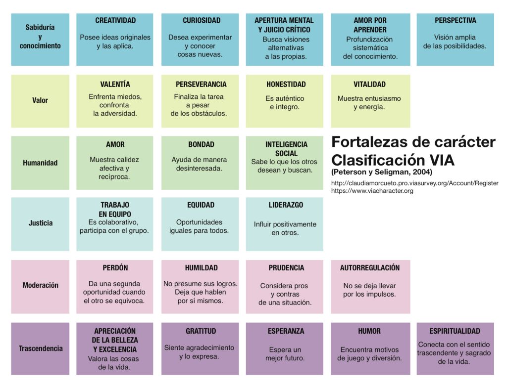 Las 24 fortalezas positivas del carácter se dividen en seis clases de virtudes:
