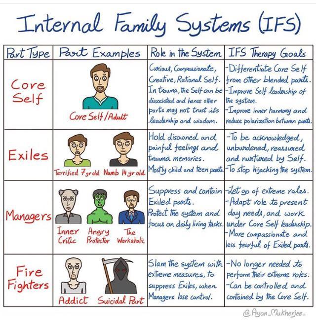 Los sistemas familiares internos, o IFS, es un tipo de terapia que cree que todos estamos formados por varias partes o subpersonalidades. Se basa en tipos de terapia familiar estructural , estratégica, narrativa y boweniana .