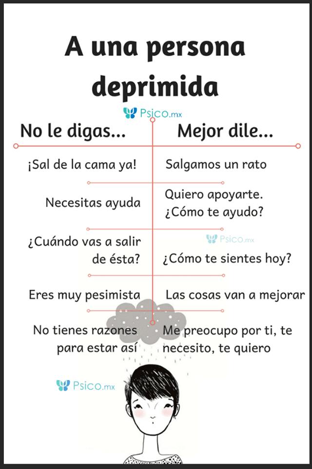 En lugar de eso, hazles saber que lamentas que se sientan tan mal y adopta una actitud de aceptación de que así es como les está afectando su depresión. Si su amigo recientemente comenzó a tomar medicamentos o a asistir a terapia, puede tomar tiempo hasta que comience a sentirse mejor.