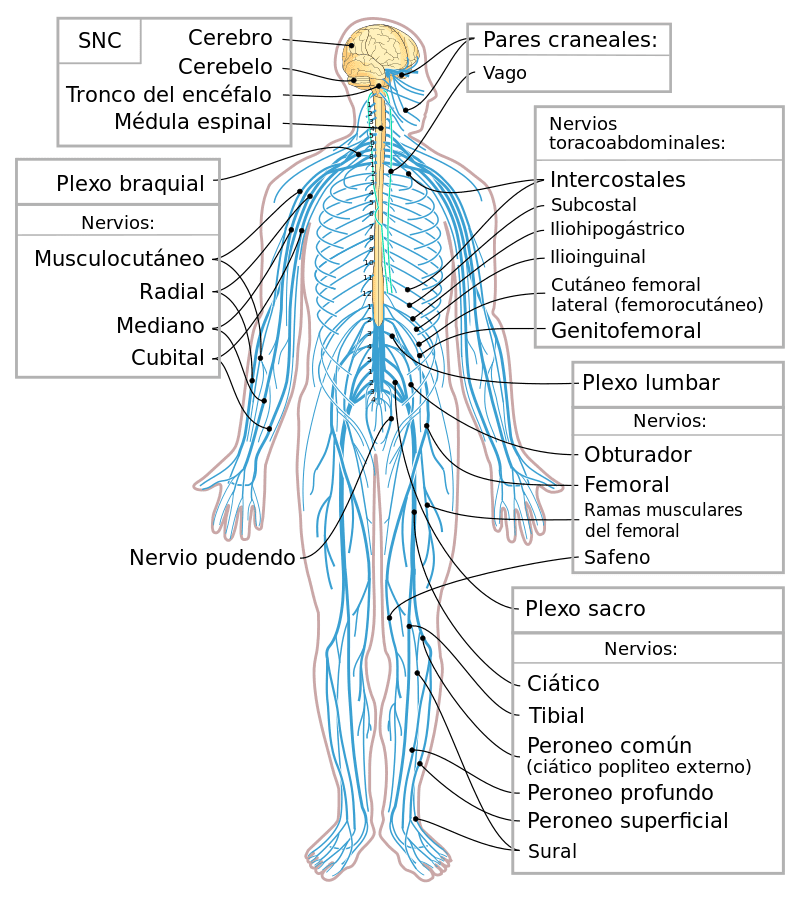 El sistema nervioso somático incluye todos los nervios que se extienden desde el cerebro y la médula espinal. No incluye el cerebro ni la columna vertebral, los cuales forman parte del sistema nervioso central . Hay dos tipos de nervios somáticos: craneales y espinales.