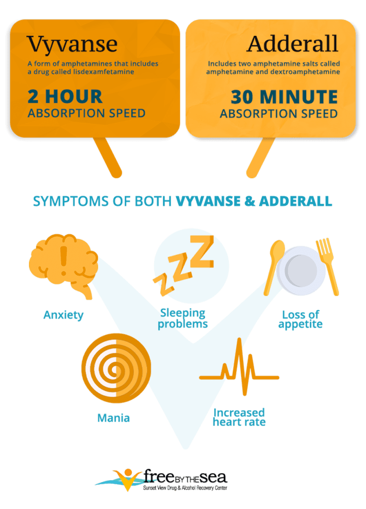 Sin embargo, existen varias diferencias entre los dos medicamentos. Los efectos de Vyvanse generalmente duran más que los efectos de Adderall; Vyvanse tiene una tasa de absorción más lenta que Adderall. Adderall también tiene un mayor potencial de ser utilizado indebidamente que Vyvanse.